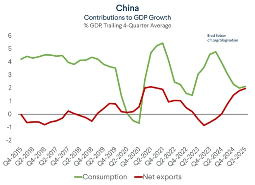 The de facto tight linkage to the dollar has clearly become a bit of a problem for many of China’s trading partners in 2025, as the yuan followed the dollar down. Throw in the yuan’s depreciation against the dollar in 2023 and ongoing deflation in China, and China’s real effective exchange rate is now extremely weak.